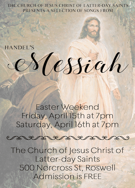• Songs from “Handel’s Messiah” sponsored by the Roswell Stake. Sat- Sun Apr 15-16, 7 PM. See poster below: