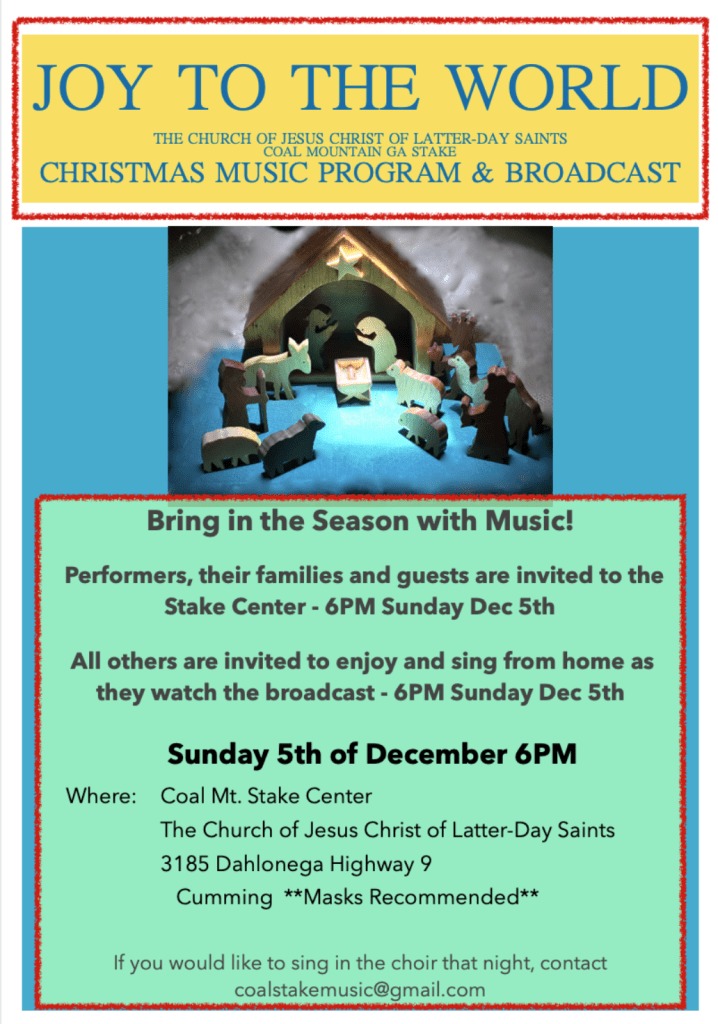 There is strength, hope, and comfort in worthy music. Please take time to partake in this month’s Music Newsletter of the Coal Mountain Georgia Stake of The Church of Jesus Christ of Latter-day Saints.