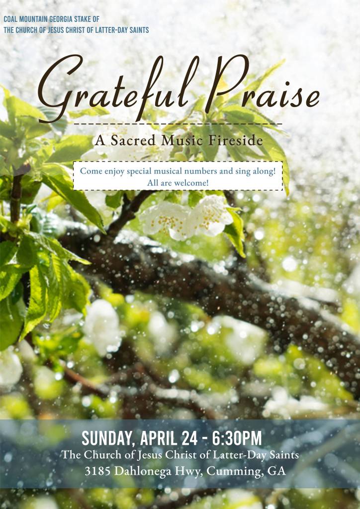 •Sacred Music Fireside “Grateful Praise” – April 24, Sunday at 6:30 PM An hour of music from the keyboard and guest musicians. Be prepared to sing along with some of the best loved hymns. A nice event to invite friends to. Coal Mountain GA Stake Center.